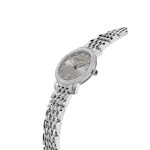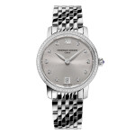 Frederique Constant Lady's Classic Slimline Watch—elegant quartz timepiece with diamond markers and bezel. Sleek steel bracelet offers timeless luxury for any occasion. Swiss precision.