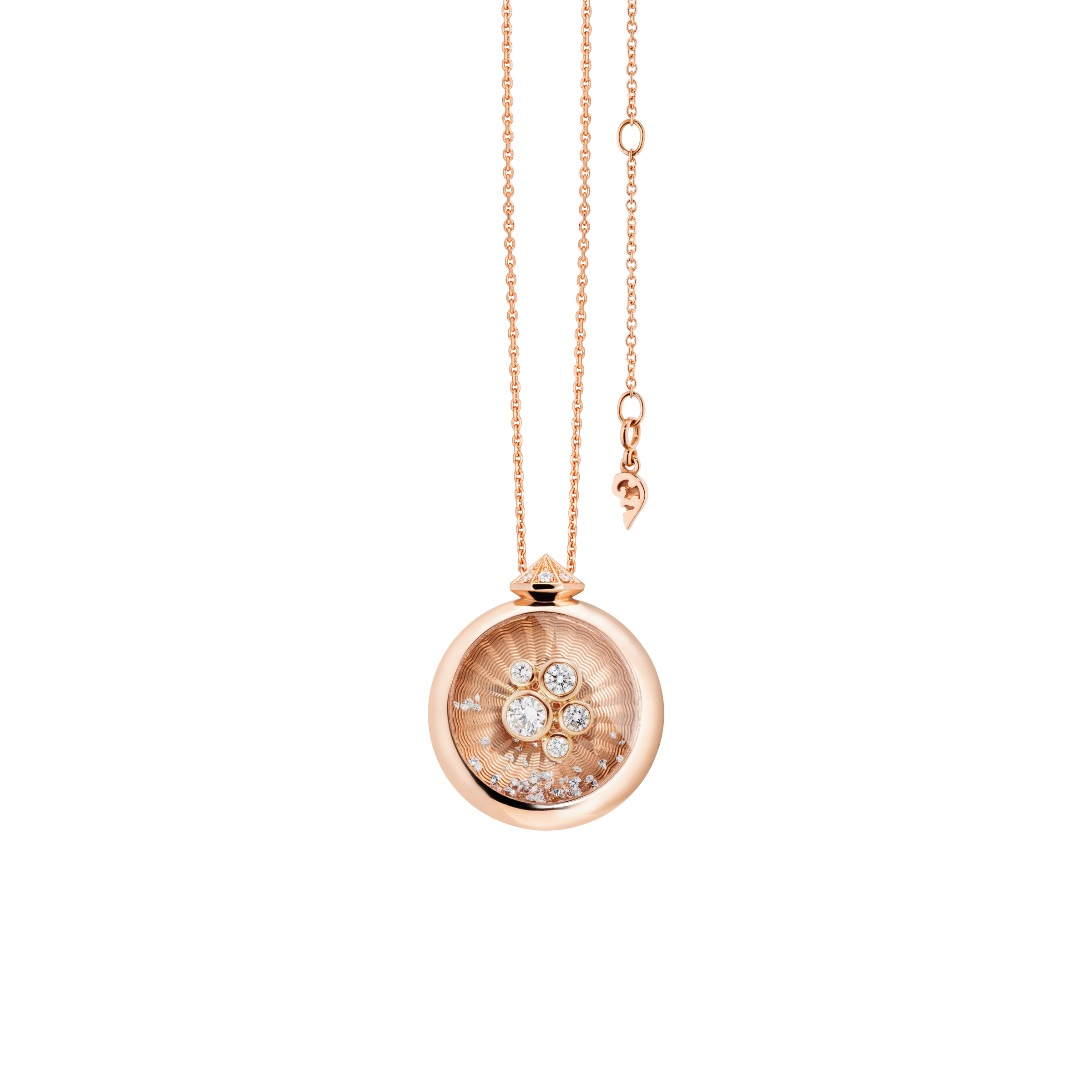 Indulge in luxury with the Prosecco diamond pendant by Capolavoro. Crafted in 18K rose gold, this piece features floating diamonds, offering timeless elegance and sparkling allure.