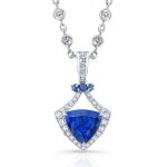 Exquisite triangular no-heat Burma sapphire and diamond pendant in platinum. Elevate elegance with this luxurious, timeless piece, perfect for special occasions or everyday sophistication.