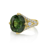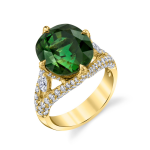 Stunning tourmaline and diamond ring in 18k yellow gold. Features a vibrant green oval tourmaline and sparkling white diamonds. Perfect for adding elegance and luxury to any occasion.